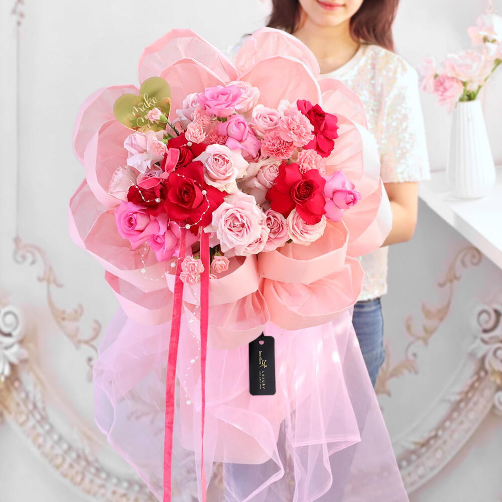 Когда любовь не знает границ, зачем сдерживаться? Великолепный букет, окутанный цветущей красотой, воспевает дух истинной любви с ноткой величия — красные розы, розы Sweet Avalanche, розовые гвоздики, розовые кустовые гвоздики, а также романтичная акриловая бирка, подчёркивающая вашу любовь.