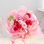 гвоздики розовые - 3 шт. розы красные - 5 шт. кустовая гвоздика светло-розовая - 2 шт. розы свит аваланш - 12 шт. розы аквапинк - 5 шт.