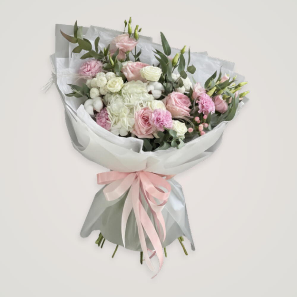 White rose - 3 шт. pink carnation - 1 шт. white hydrangea - 1 шт. зелёные листья - 3 шт. pink roses - 1 шт. стебель розовой эустомы - 5 шт.