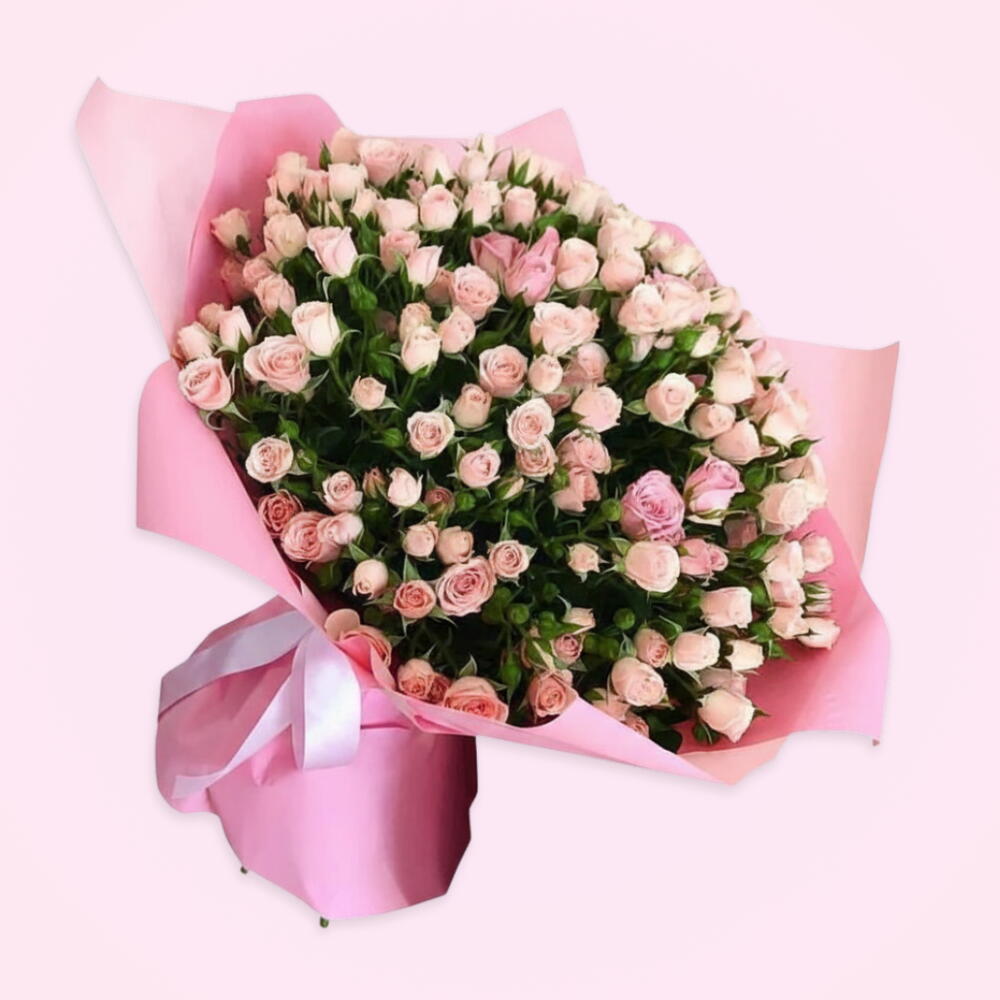 10 стеблей светло-розовой спрей-розы, 5 стеблей светло-фиолетовой спрей-розы,