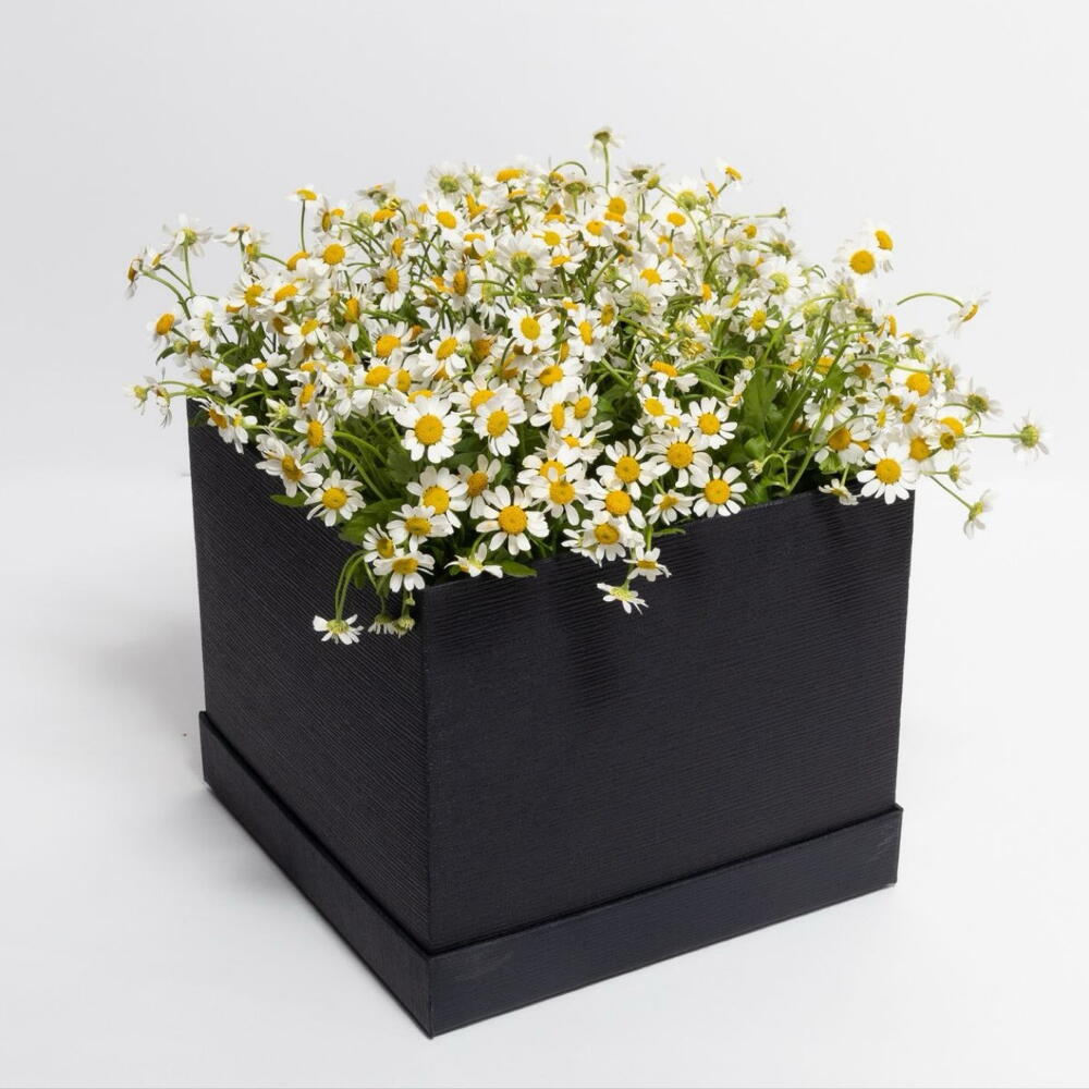 Этот потрясающий букет состоит из множества цветов маргаритки разных оттенков белого и желтого, которые создают мистическую и чарующую атмосферу в черной коробке.