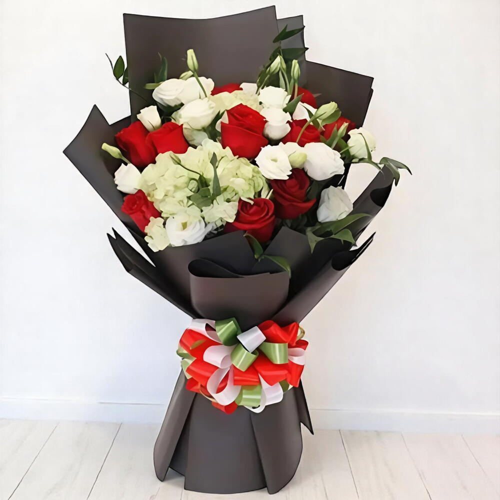 Элегантный букет к Национальному дню ОАЭ – красные, белые и зелёные цветы с декоративными лентами
