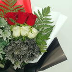 Патриотический букет, подчёркивающий цвета флага ОАЭ, включает насыщенные красные и белые розы, дополненные тёмно-зелёной листвой и необычными серо-зелёными цветами, перевязанный лентой, символизирующей гордость нации.