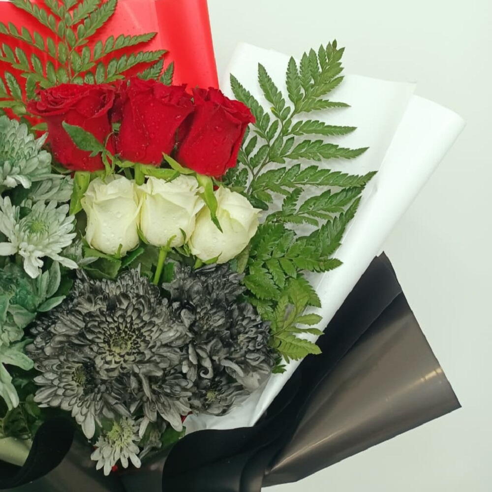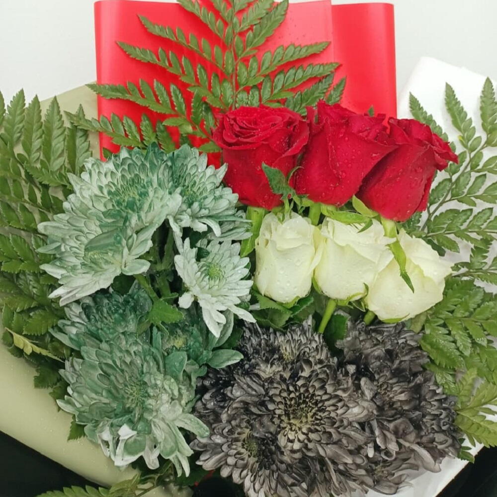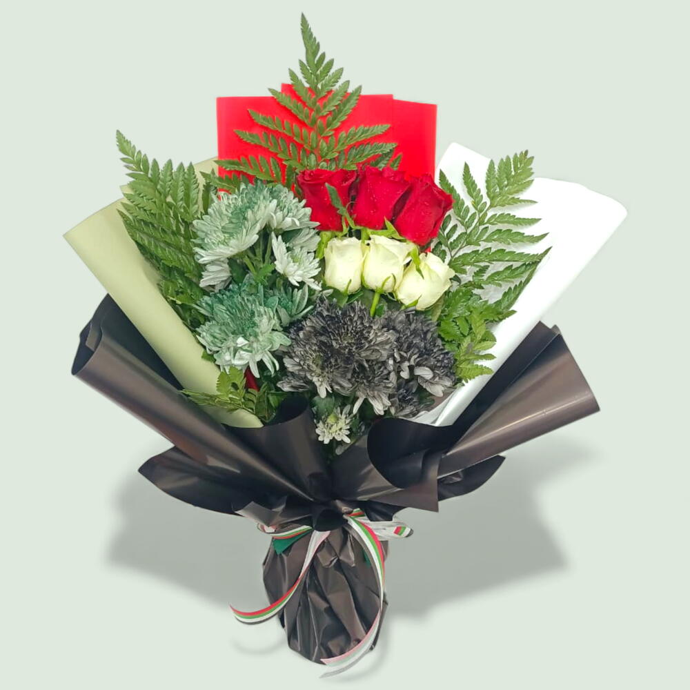 Патриотический букет, подчёркивающий цвета флага ОАЭ, включает насыщенные красные и белые розы, дополненные тёмно-зелёной листвой и необычными серо-зелёными цветами, перевязанный лентой, символизирующей гордость нации.
