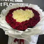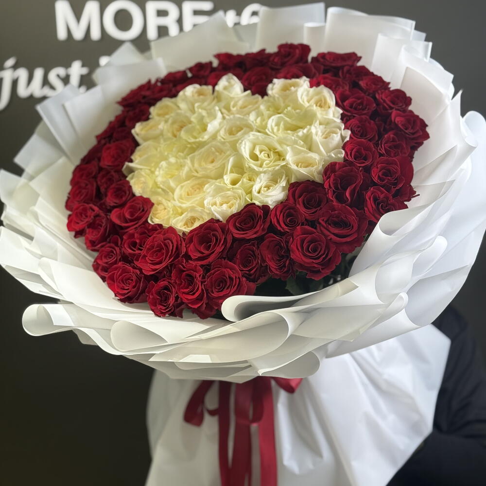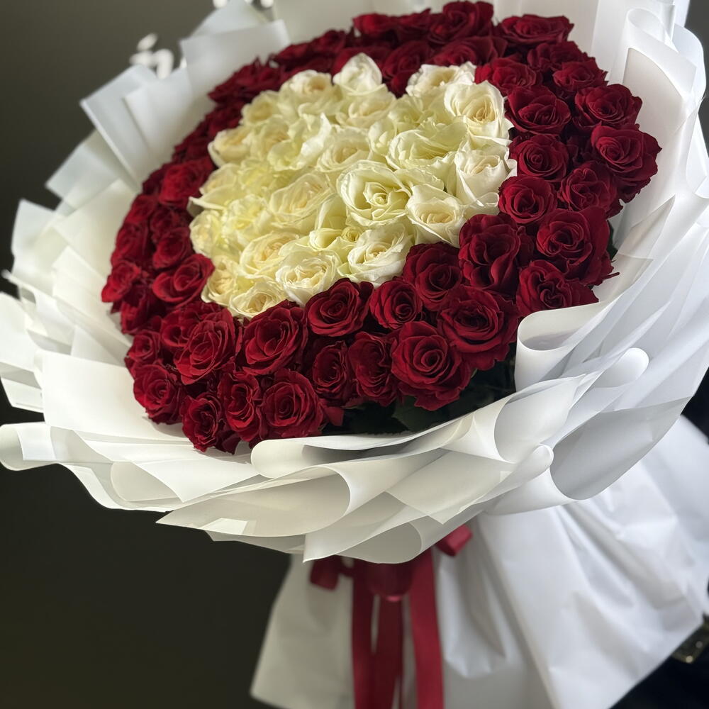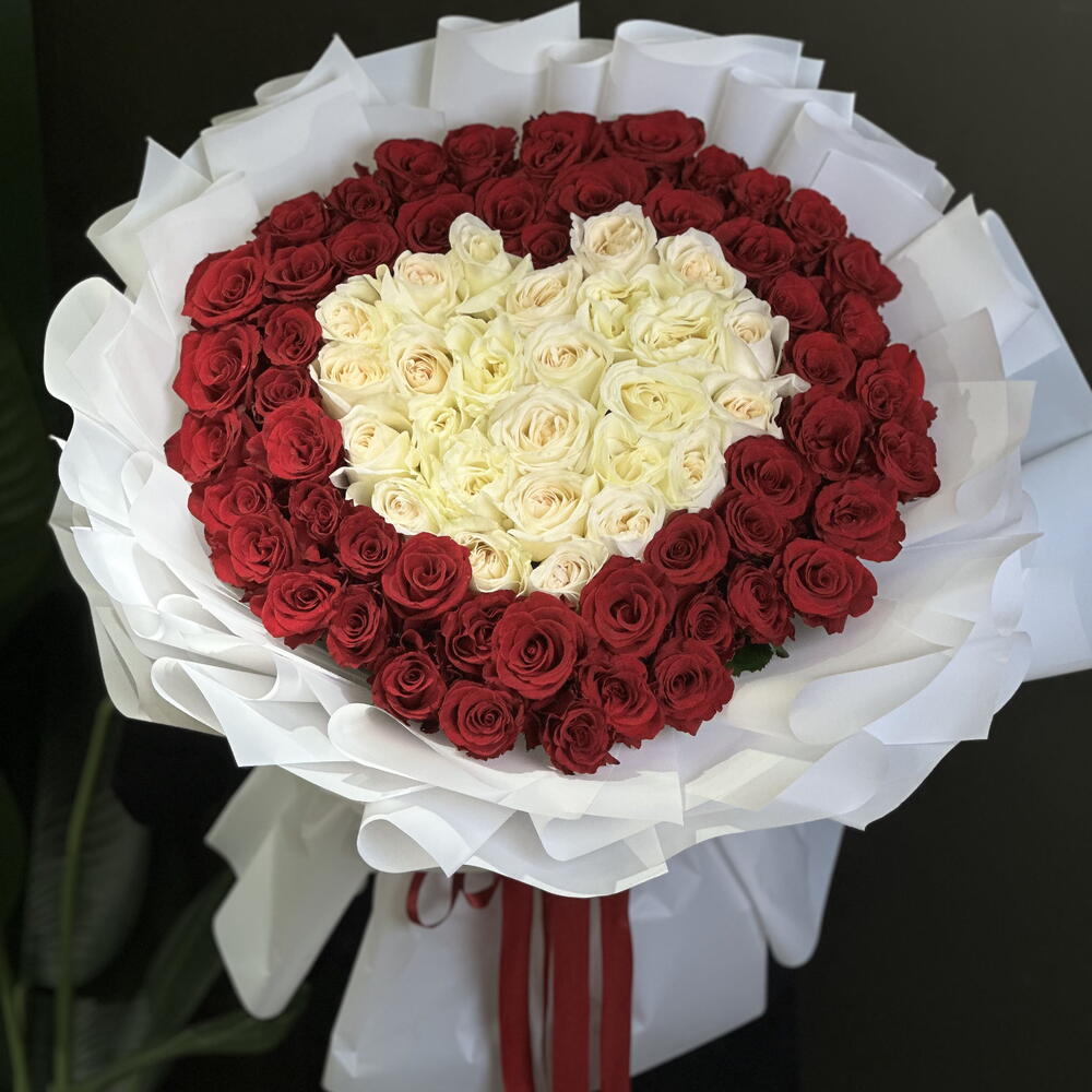 Встретьте Новый год с вечной элегантностью. Этот роскошный букет представляет собой эффектную круглую композицию из глубоких красных роз, окружающих сияющее сердце из роз цвета слоновой кости, символизирующее любовь, процветание и новые начинания. Упакованный в премиальную белую бумагу с яркими красными акцентами, он является идеальным выражением праздника, надежды и новых стартов. Идеален в качестве подарка на Новый год, для больших торжеств, юбилеев или чтобы произвести сильное первое впечатление в наступающем году.