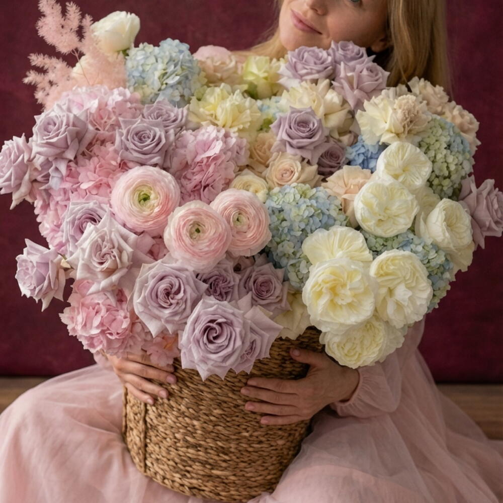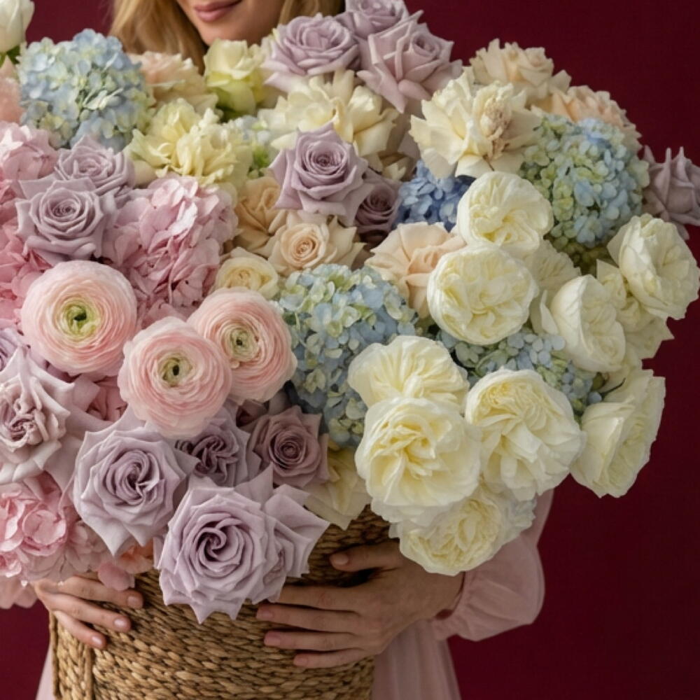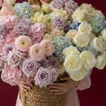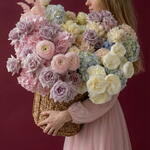 The charming flower basket stands out with an excellent combination of 20 pieces of exquisite hydrangea, 5 pieces of romantic ranunculus Hanoi, 10 pieces of lush peony-shaped pink flower and 75 pieces of strawberry-red rosebud. The elegant fern of asparagus adds a delicate green accent, making this composition truly magnificent. Give your loved ones a world of colorful dreams and magical feelings with this stunning flower basket. Amazing gift for your love, wife and mom