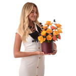 В цветочном ансамбле 10 сияющих оранжевых роз, символизирующих тепло и восхищение, 4 яркие оранжевые гвоздики для глубины и радости и 4 веточки чёрного эвкалипта для контраста и современного акцента. 3 веточки чёрного лимониума, 4 стебля рускуса и 2 высушенных пальмовых листа завершают дизайн, создавая поразительно сбалансированную визуальную композицию. Эта элегантная композиция сочетает огненные оранжевые цветы с чарующим Dior Hypnotic Poison Eau de Parfum (100 мл) — ароматом, источающим тайну, притягательность и вечную элегантность.