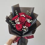 1. 6 темно-красных роз 2. Гипсофила, зеленая листва 3. Букет, собранный вручную, обернут в элегантную черную бумагу с бордовой лентой 4. Романтичный, современный букет — готов к дарению Смелый и неотразимый, этот букет сочетает в себе шесть бархатистых красных роз с воздушной гипсофилой и серебристым эвкалиптом для контраста. Обернутый в роскошную черную пленку и атласную ленту, он является выражением страсти и восхищения — идеально подходит для годовщин, дней рождения, предложений руки и сердца, Дня святого Валентина или просто так, для эффектного подарка. Идеально подходит для жен, подруг, невест и всех, кого вы любите. Время доставки Закажите до 21:00 для доставки в тот же день по Дубаю, Абу-Даби и всем эмиратам. Возможна доставка в полночь. Выберите дату и часовой интервал экспресс-доставки при оформлении заказа. Наши курьеры вручную доставляют каждый букет, чтобы розы оставались в вертикальном положении, увлажненными и безупречными на протяжении всей транспортировки. Советы по уходу Подрежьте стебли на 1–2 см под углом 45° и поместите растение в свежую прохладную воду. Меняйте воду каждые 1–2 дня; держите подальше от источников тепла и прямых солнечных лучей. Удалите листву ниже уровня воды, чтобы предотвратить размножение бактерий.