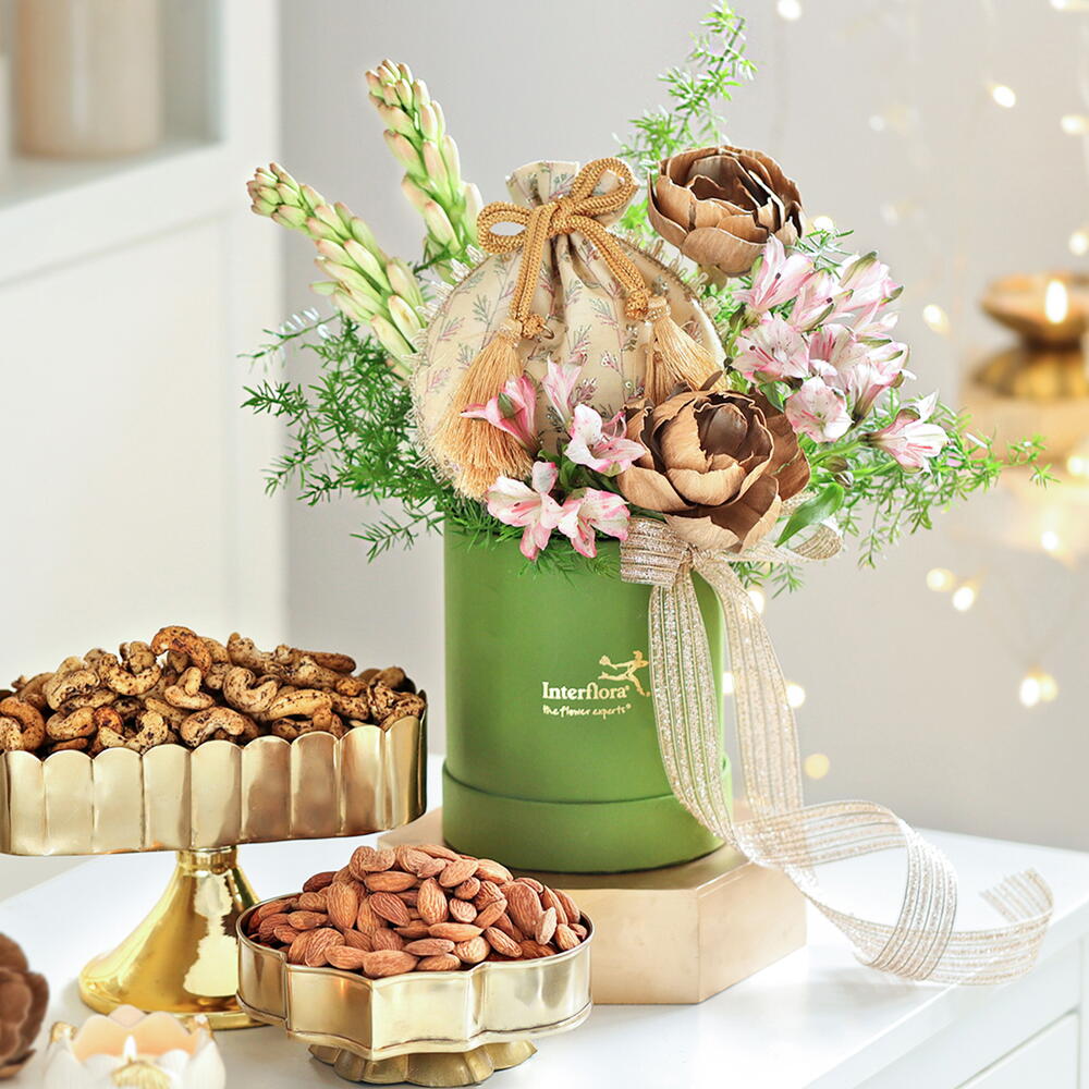 Встречайте целебное с ноткой цветочной любви. Этот роскошный ассортимент — это сочетание праздничного изобилия и приятных наслаждений, доведенных до совершенства: солёный жареный миндаль, кешью с чёрным перцем, тубероза, розовая альстромерия, сушеные цветы золотистого пиона и спрингери.