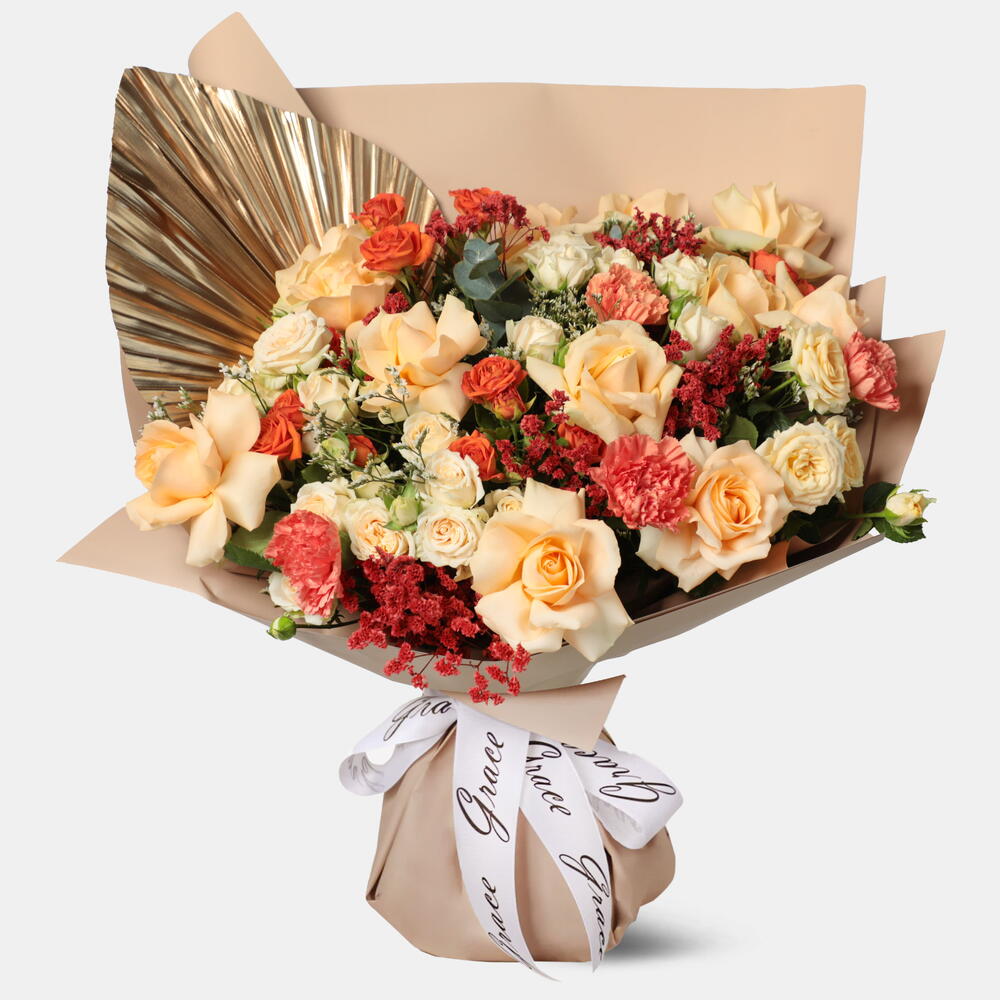Limonium - 1 шт. dried flowers - 2 шт. carnation - 5 шт. букет роз в брызгах - 3 шт. персиковые розы - 11 шт.