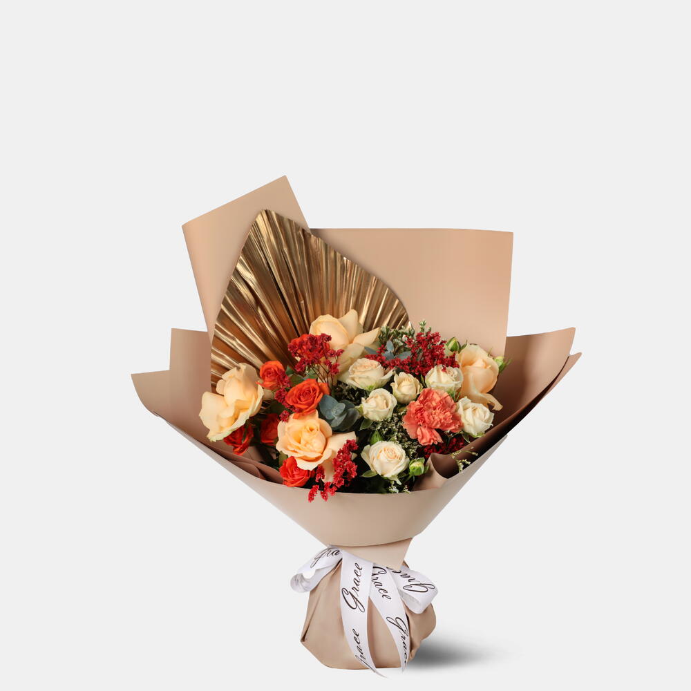 Limonium - 1 шт. dried flowers - 2 шт. carnation - 1 шт. персиковые розы - 4 шт. роза спрей 2 - 1 шт.