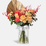 Oasis Serenity в вазе представляет собой гармоничное сочетание персиковых роз, ярких оранжевых кустовых роз и нежных гвоздик, красиво дополненное пышной зеленью и фактурной высушенной пальмой. Эта элегантная композиция приносит тепло, утонченность и легкую нотку природного очарования, делая её идеальной для подарка, декора или особых случаев.