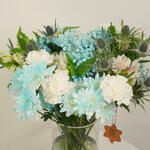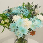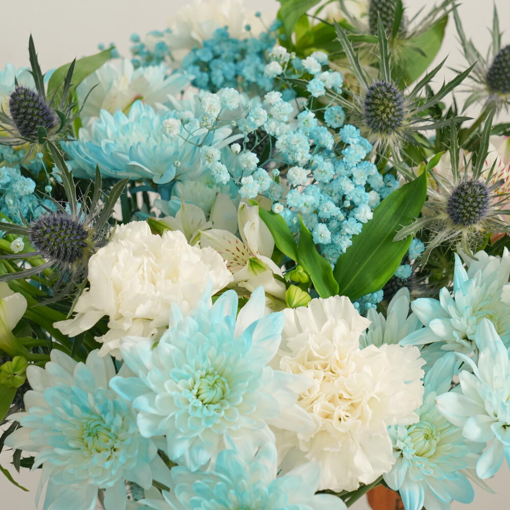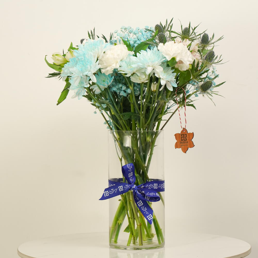 Добавьте в свой интерьер частичку океанской красоты с помощью Oceanic Charm. Этот изысканный букет состоит из 10 синих хризантем, 5 белых альстромерий, 5 синих эрингиумов, нежно-голубой гипсофилы и 5 белых гвоздик, элегантно расположенных в цилиндрической стеклянной вазе. Современный и освежающий подарок, сочетающий в себе изысканность и естественное очарование.