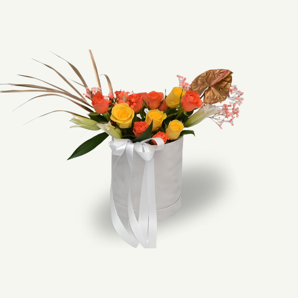 Яркое сочетание 2 белых стеблей лилии, 20 оранжевых и жёлтых роз, золотого антуриума, листа ареки и оранжевой гипсофилы, нежно оформленное в круглой белой бархатной коробке для элегантной и сияющей цветочной презентации.