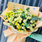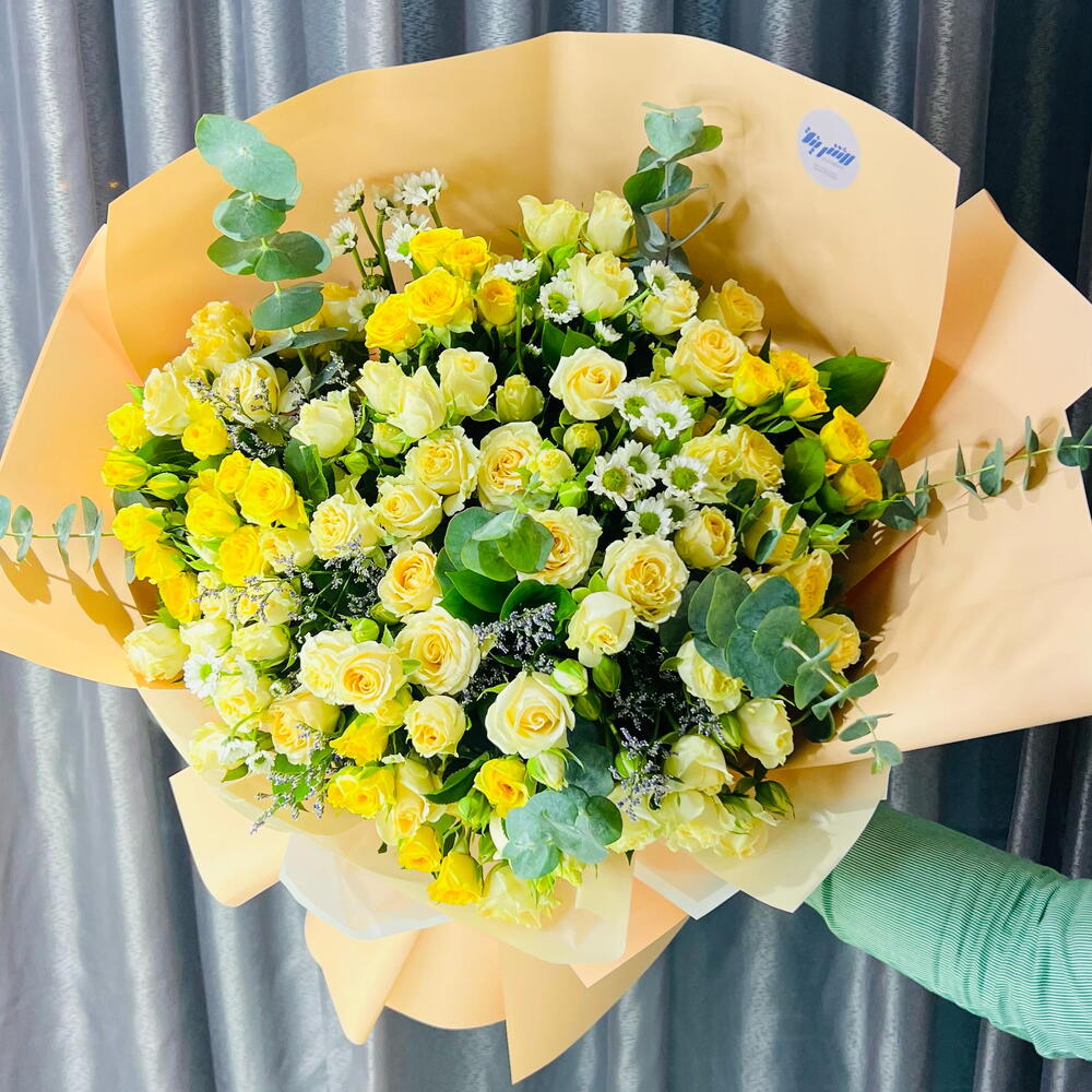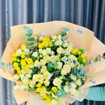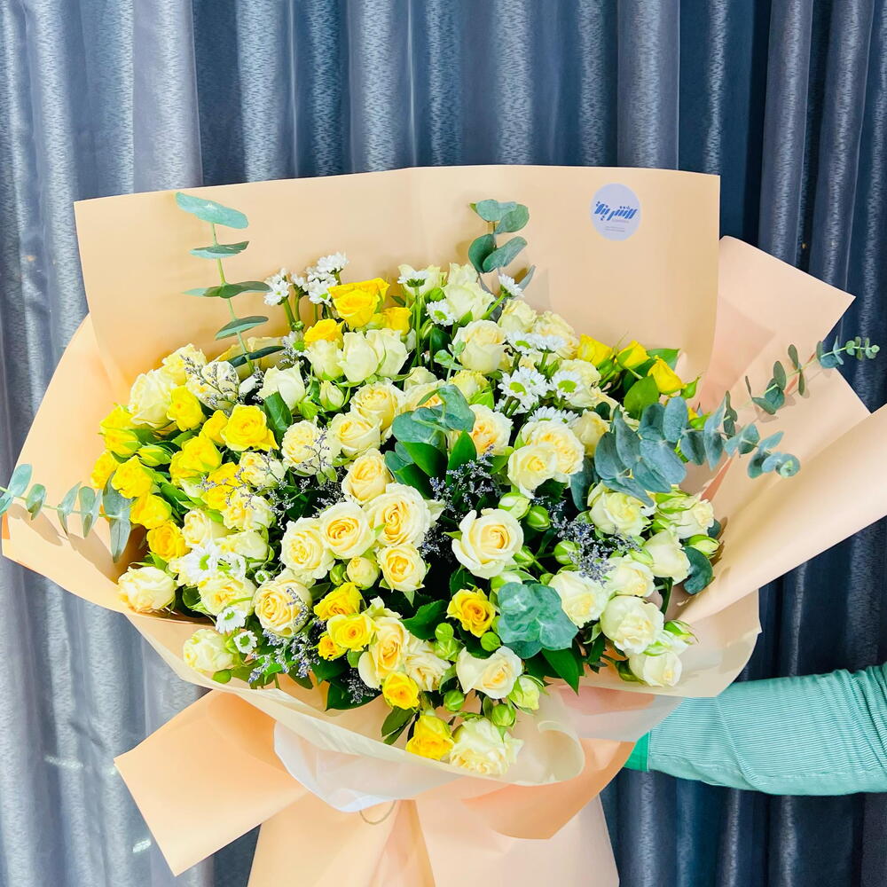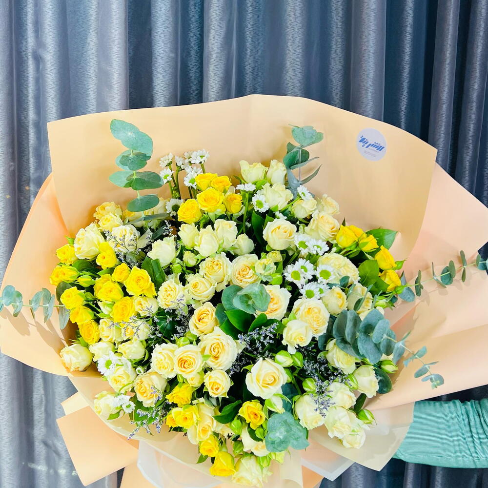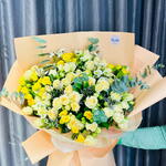 Наполните комнату волной величественной элегантности и свежести с этим великолепным моно-букетом. С любовью собранный из 3 веточек успокаивающего эвкалипта, 5 ярких хризантем и 15 изящных мини-роз, всё завернуто в 10 листов изысканной оберточной бумаги. Этот букет — идеальный баланс очарования и красоты, излучающий сияющую ауру, идеально подходящий для того, чтобы украсить любое событие или пространство.