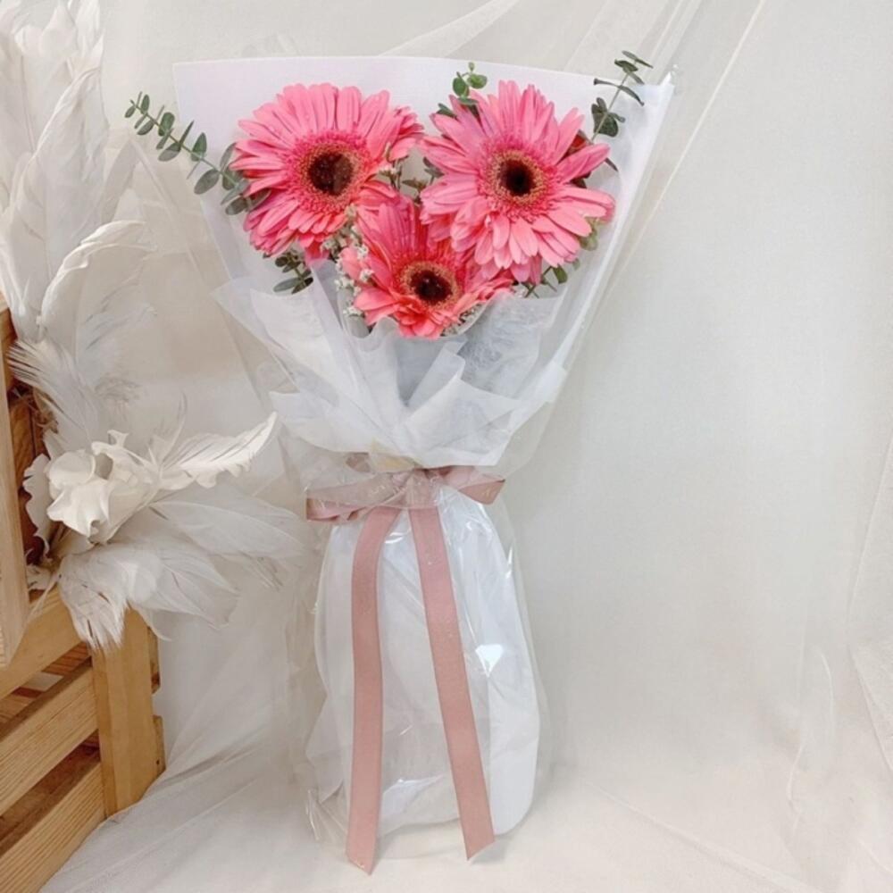 Весёлый букет из 3 ярких гербер, в сочетании со свежей зеленью для нотки природной элегантности. Символизируя радость, веселье и позитивную энергию, этот букет идеально подходит для дней рождения, праздников или чтобы скрасить чей-то день.