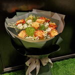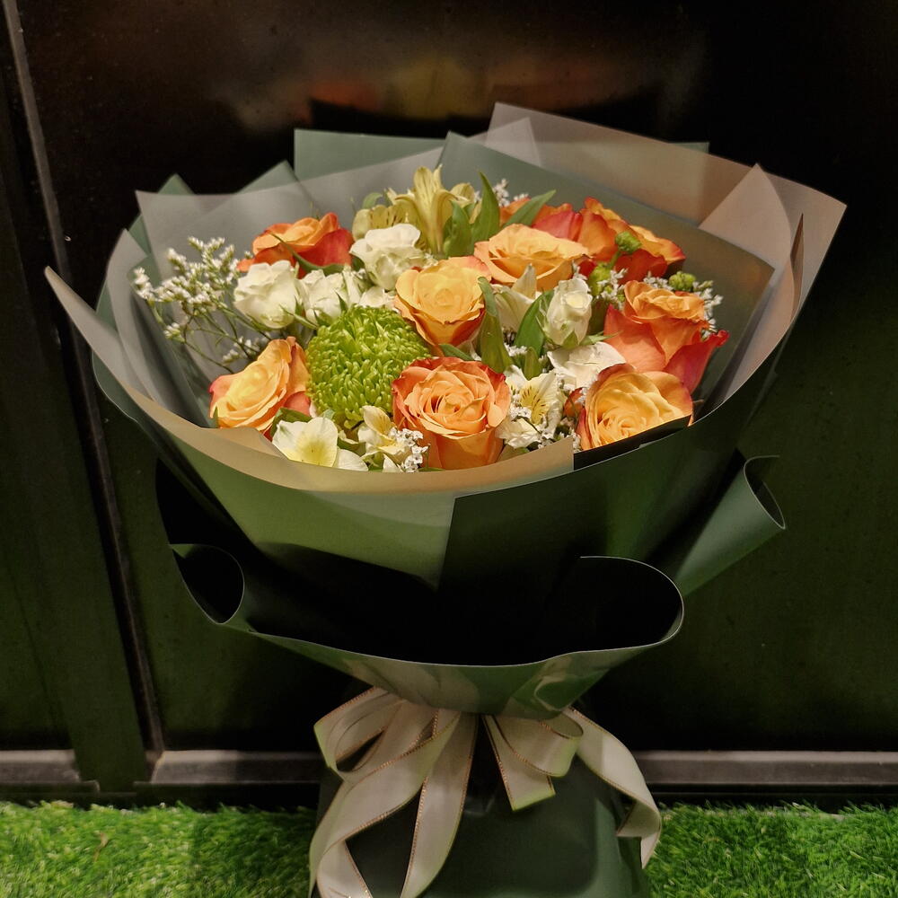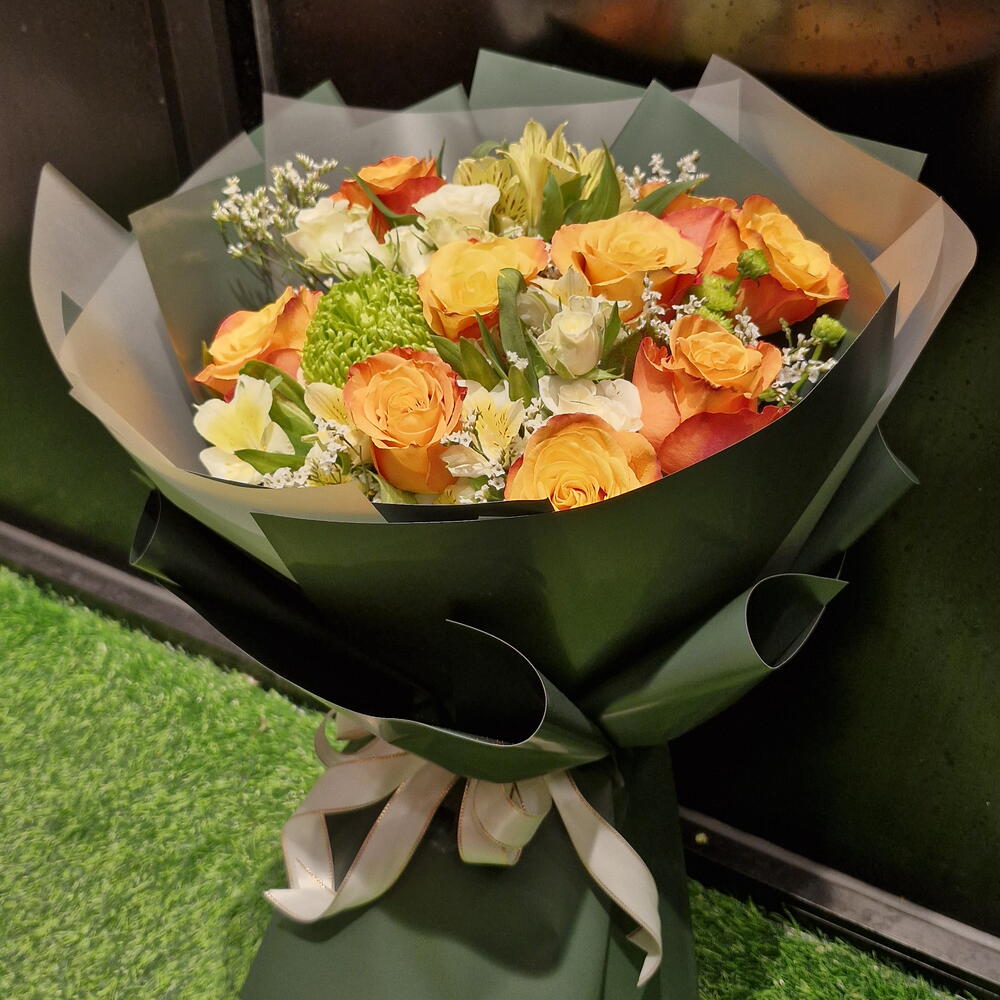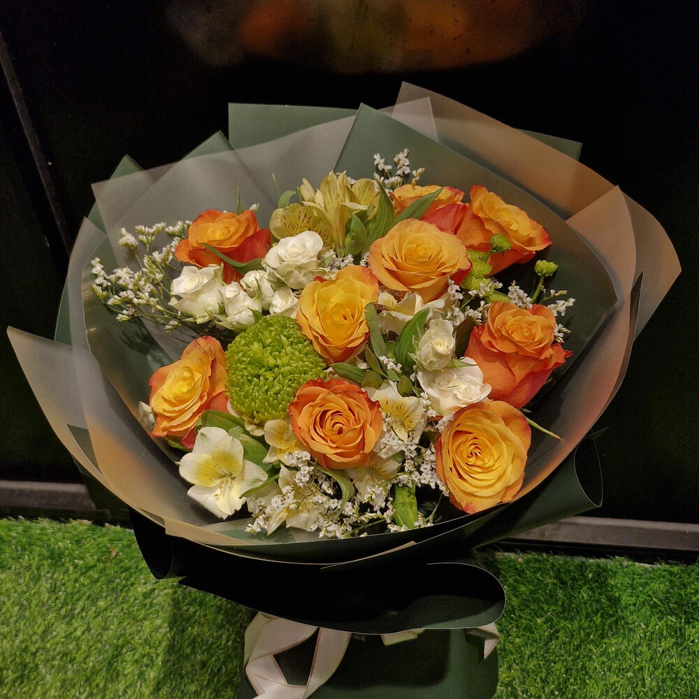 alstroemeria white - 4 шт. белая мини-роза - 8 шт. лимониум белый - 5 шт. оранжевые розы - 9 шт. зелёный декор - 1 шт.
