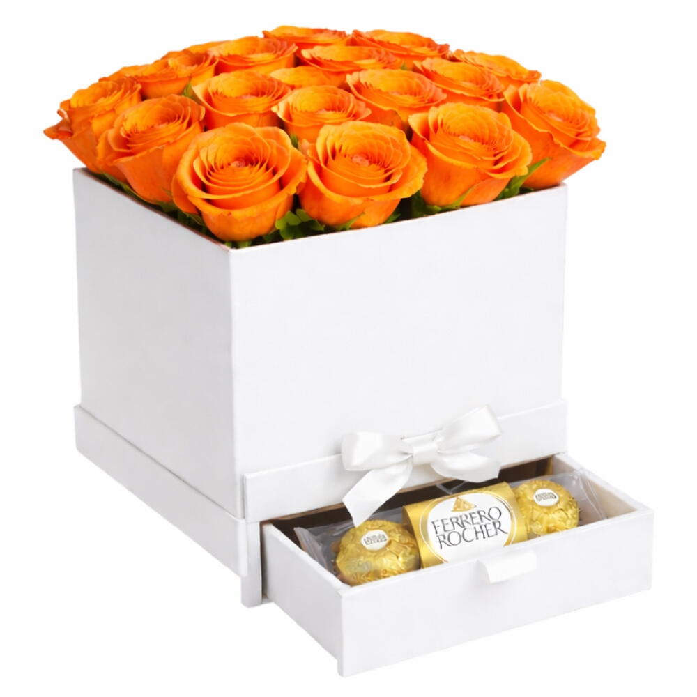 Побалуйте себя изысканностью этой роскошной композиции Flowers in a Box с очаровательными оранжевыми розами. Пятнадцать ярких свежих бутонов, аккуратно размещённых в нашей эксклюзивной коллекции люксовых коробок для роз, придадут особый шарм любому поводу. В довершение приятного сюрприза — упаковка неотразимо насыщенных Ferrero Rocher, включающая шесть роскошных конфет для истинного наслаждения. Идеальное сочетание изящества и сладостей — прекрасный подарок, чтобы очаровать ваших близких.