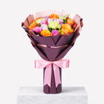 Pink rose - 6 шт. green carnation - 4 шт. hypericum - 3 шт. pink eustoma - 2 шт. orange rose - 6 шт. листья фисташки - 2 шт.