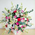 White rose - 10 шт. pink spray rose - 10 шт. light pink rose - 20 шт. carnation white - 20 шт. dark pink rose - 20 шт. white spray rose - 10 шт. euclyptus - 5 шт. white orchid - 40 шт. гвоздика тёмно-розовая - 10 шт. гвоздика светло-розового цвета - 10 шт.