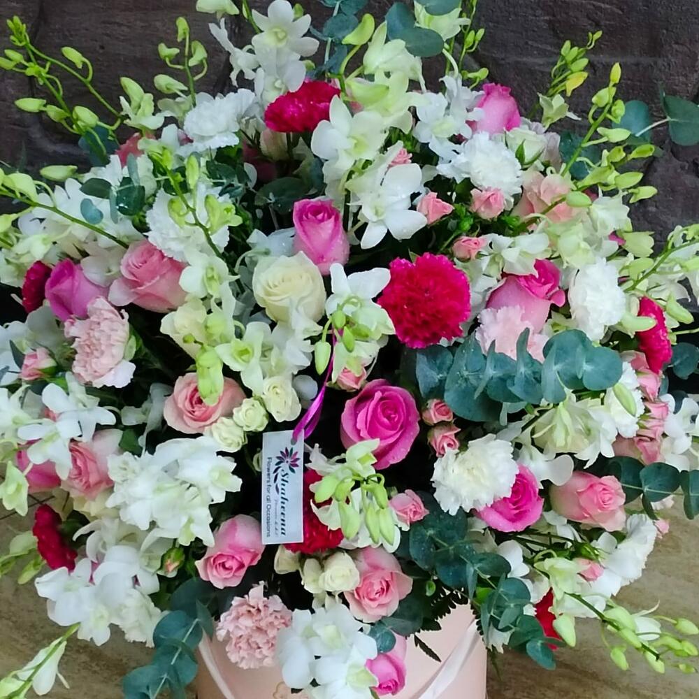 Орхидеи, розы и гвоздики в коробке. Эта элегантная односторонняя композиция состоит из 40 белоснежных орхидей, 20 светло-розовых роз, 20 темно-розовых роз, 10 белых роз, 10 кустовых роз белого цвета, 10 кустовых роз розового цвета, 10 светло-розовых гвоздик, 10 темно-розовых гвоздик и 20 белых гвоздик, которые прекрасно дополняются свежими зелеными наполнителями в круглой коробке. Сочетание изящных белых орхидей с яркими розовыми розами и гвоздиками создает изысканный и утонченный букет, идеально подходящий для любого особого случая, требующего элегантности и очарования.