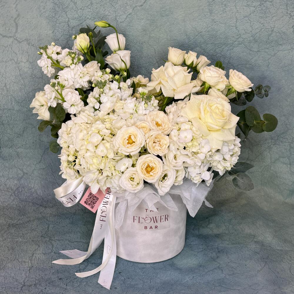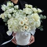 Побалуйте себя роскошью с Oriental White. Эта потрясающая композиция из белых гортензий, эустомы, роз, кустовых роз и маттиолы тщательно упакована в большую белую бархатную коробку и станет идеальным подарком на любой случай.