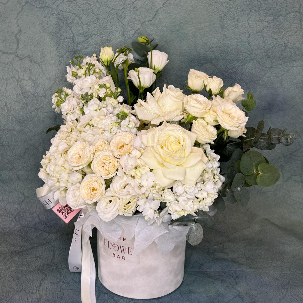 Eucalyptus - 1 шт. White rose - 2 шт. white spray rose - 4 шт. white velvet box - 1 шт. white hydrangea - 3 шт. white eustoma - 1 шт. подарочный пакет - 1 шт. white matthiola - 3 шт.