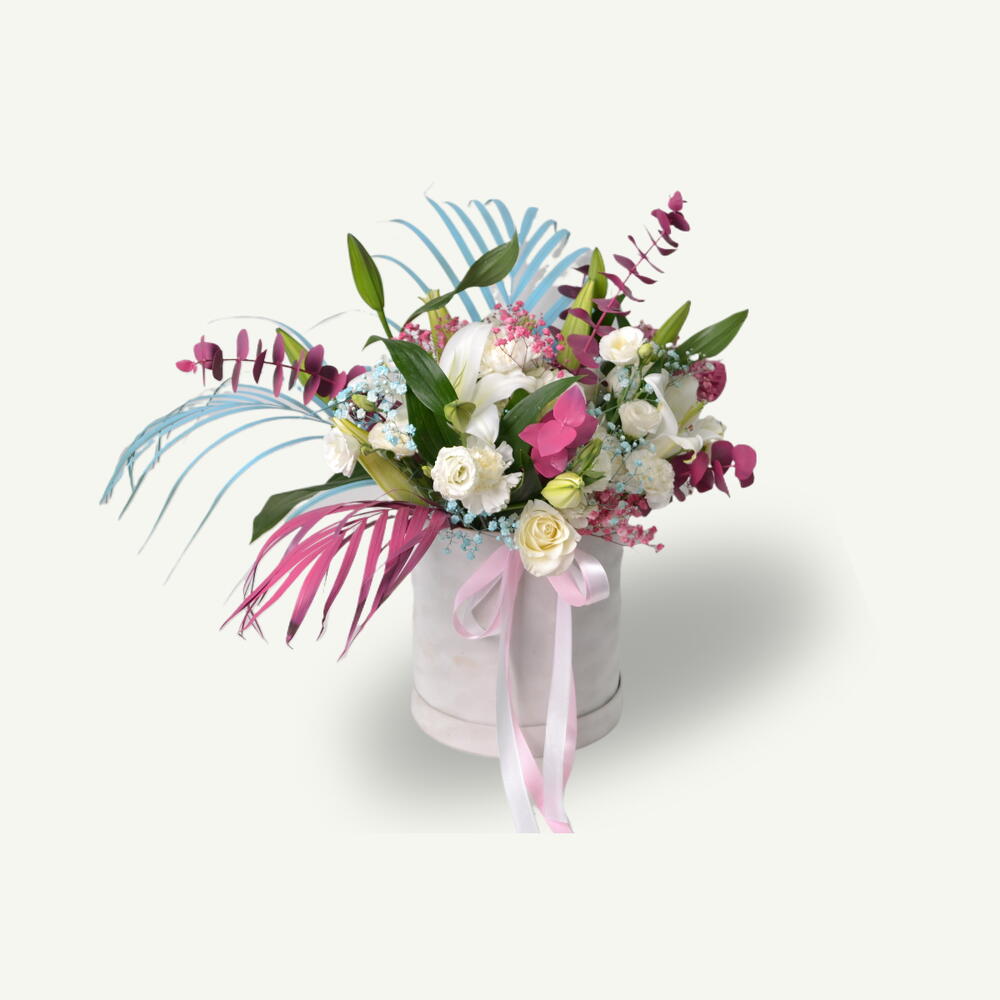 Смесь: 10 белых роз, 4 ветки белой лилии, 3 ветки белого лизиантуса, 5 белых гвоздик, 1 белая гортензия, розово-голубые листья ареки, розовый эвкалипт и розово-голубая гипсофила, аккуратно уложенные в белую бархатную коробку для создания мечтательной и элегантной композиции.