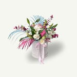 white carnations - 5 шт. white lisianthus - 3 шт. white hydrangea - 1 шт. white roses - 10 шт. розовый эвкалипт - 1 шт. стебель белых лилий - 4 шт. розовые и синие листья ареки - 1 шт. розовая и голубая гипсофила - 1 шт.