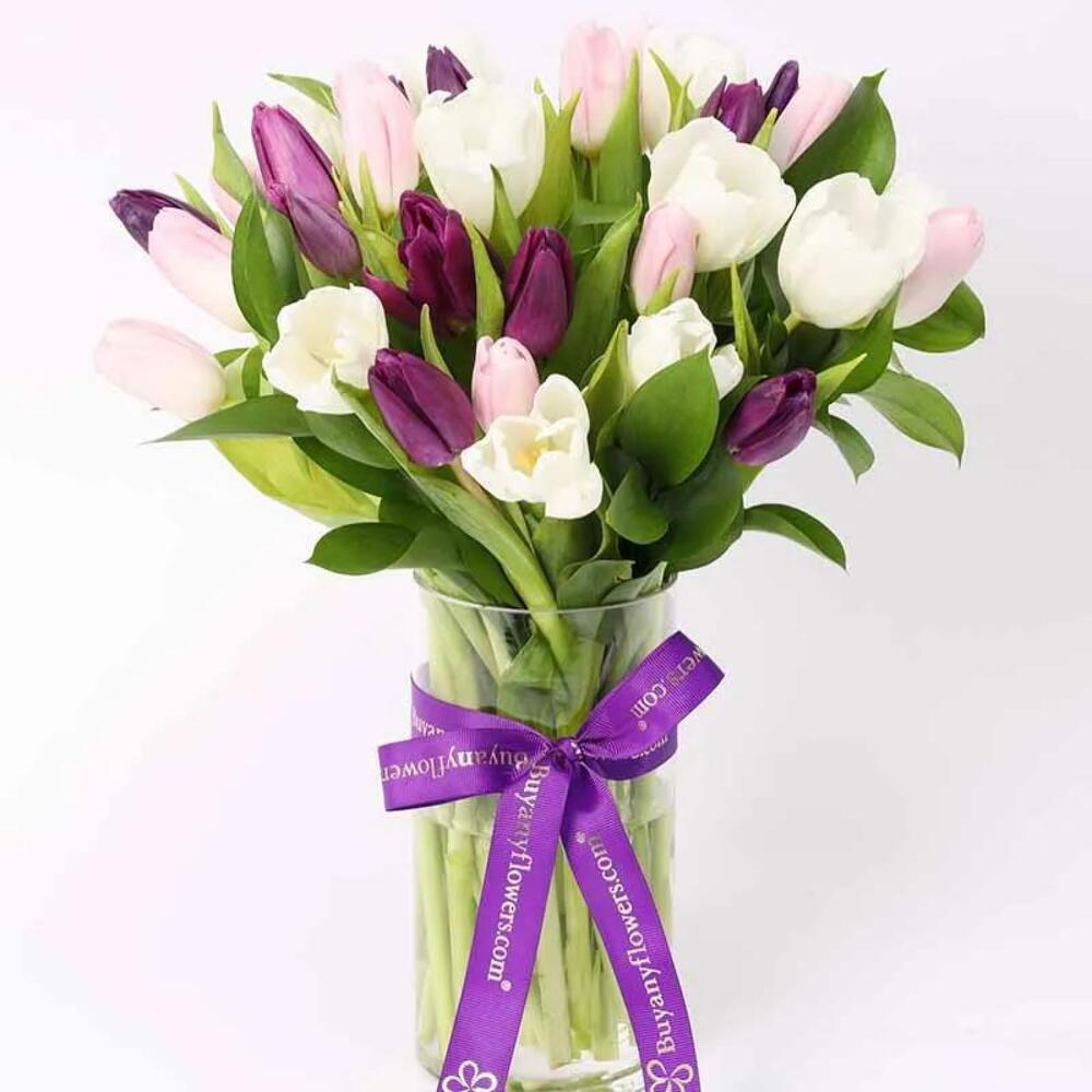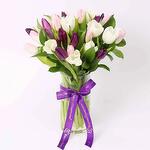 pink tulips - 10 шт. white tulips - 10 шт. фиолетовые тюльпаны - 10 шт. одна ветка рускуса - 5 шт. оформлено в стеклянной вазе и с бантом из ленты - 1 шт.