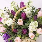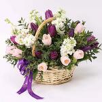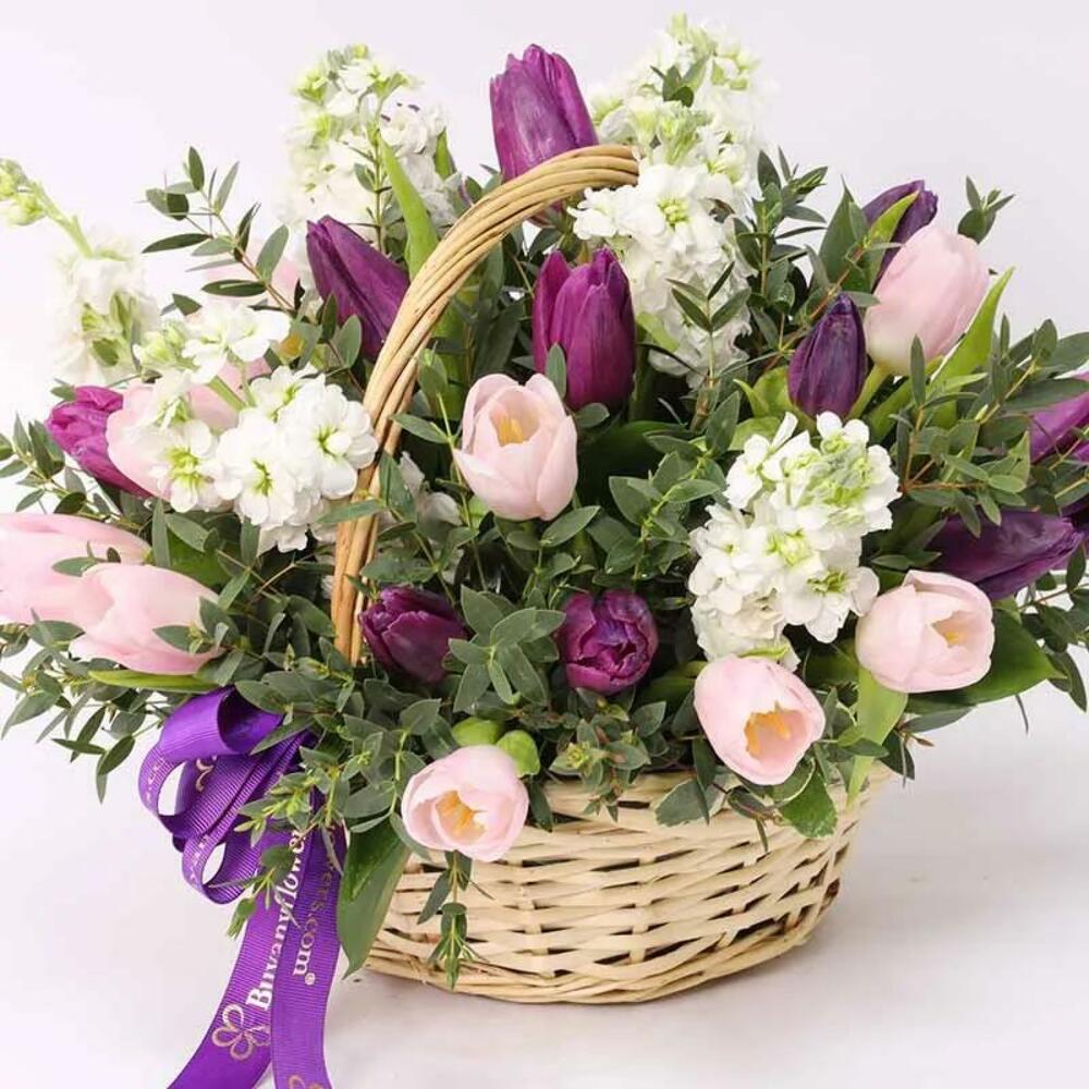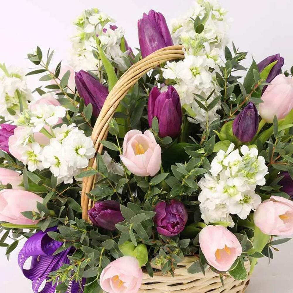 pink tulips - 10 шт. фиолетовые тюльпаны - 10 шт. white matthiola - 6 шт. корзина с ручкой и перевязана бантом из ленты - 1 шт.