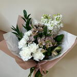 Ruscus - 3 шт. carnation white - 5 шт. маттиола белая - 2 шт. розовая альстромерия - 5 шт.