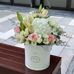 Limonium - 2 шт. Lily - 4 шт. rose pink - 5 шт. spay rose white - 4 шт. haydrenga white - 2 шт. crisantemos white - 4 шт.