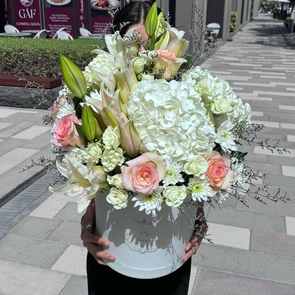 Limonium - 2 шт. Lily - 4 шт. rose pink - 5 шт. spay rose white - 4 шт. haydrenga white - 2 шт. crisantemos white - 4 шт.