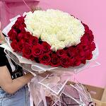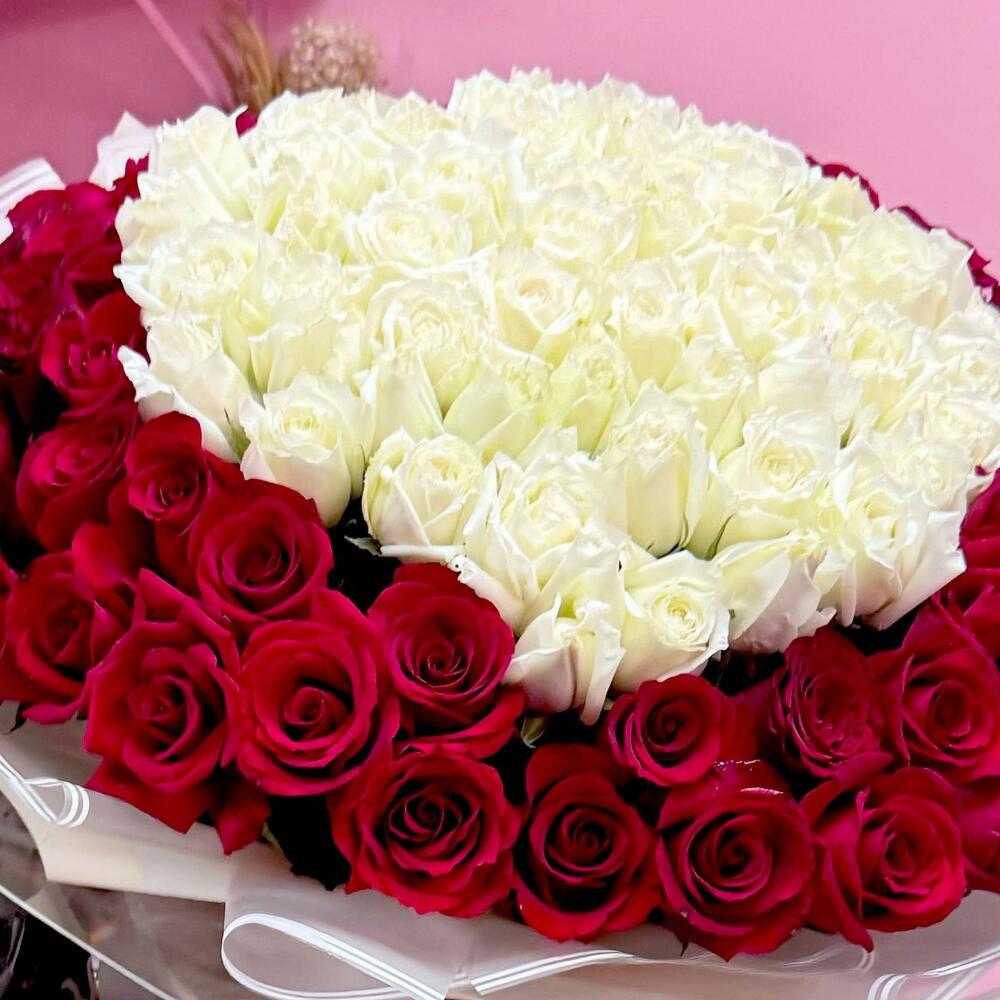 *Описание:* Великолепная и романтическая цветочная композиция в форме сердца, выполненная исключительно из роз. В центре композиции искусно расположены элегантные белые розы, а вокруг — насыщенные красные розы, символизирующие любовь и страсть. Этот букет, упакованный в роскошную бумагу чёрных и бронзовых тонов, станет смелым выражением чувств и идеально подойдёт для годовщин, предложений руки и сердца или незабываемых романтических жестов.