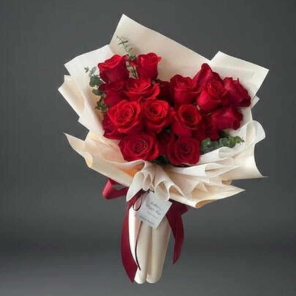 Букет — это элегантная, стильная композиция из темно‑красных роз, уложенных в мягкую кремовую бумажную обёртку, сложенную деликатными многослойными складками. Розы плотно сгруппированы, их бархатистые лепестки сияют на фоне ненавязчивой зелени-наполнителя, придающей свежий контраст. Богатая багряная лента завязана изящным бантом у основания стеблей, придавая всему изделию роскошную, отполированную отделку, которая подчёркивает классическую романтику красных роз в современной, стильной подаче.