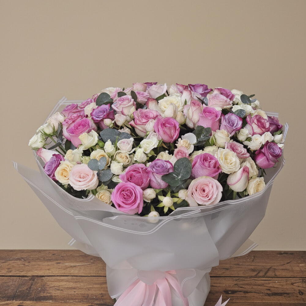 Откройте для себя непреходящее очарование этого великолепного букета, искусно созданного нашими флористами. Он состоит из пятнадцати королевских пурпурных роз, мгновенно притягивающих взгляд, которые прекрасно сочетаются с тремя освежающими стеблями эвкалипта, добавляющими нотку бодрящей зелени. Композицию дополнительно украшают пять белоснежных розочек, а также пять розовых розочек, придающих букету нежный румянец. Завершают эту потрясающую композицию двадцать пять розовых розочек, различающихся по оттенкам, добавляющих глубины и объема. В результате получился шедевр, демонстрирующий мастерство природы в каждом цветке, идеальное воплощение самых прекрасных моментов жизни.