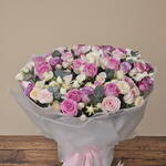 White rose - 7 шт. purple rose - 12 шт. ветки эвкалипта - 3 шт. микс розовых стеблей - 23 шт. белый лизиантус - 3 шт.