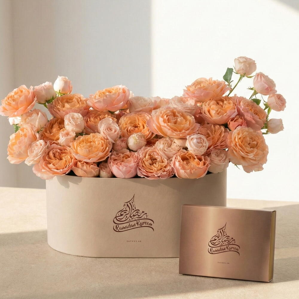 Поднимите свой рамаданский подарок на новый уровень с помощью роскошного подарочного набора Pastel Bloom Ramadan Luxury Gift Set – изысканного сочетания нежно-персиковых роз и полного ассортимента премиальных рамаданских сладостей. Этот роскошный цветочный и гастрономический ансамбль, созданный для элегантного проведения ифтара и престижных корпоративных подарков, сочетает в себе нежную цветочную красоту и известные ближневосточные кондитерские изделия. В набор входят пышные персиковые розы Julietta и розовые розы Bombastic, расположенные в большой овальной коробке Ramadan Kareem. В дополнение к набору – изысканные конфеты Mirzam, финики премиум-класса Bateel, пахлава из фиников, шоколад Patchi и рамаданские конфеты ZUVEES. Идеальное выражение щедрости и утонченного вкуса, этот рамаданский подарочный набор призван впечатлить и порадовать.