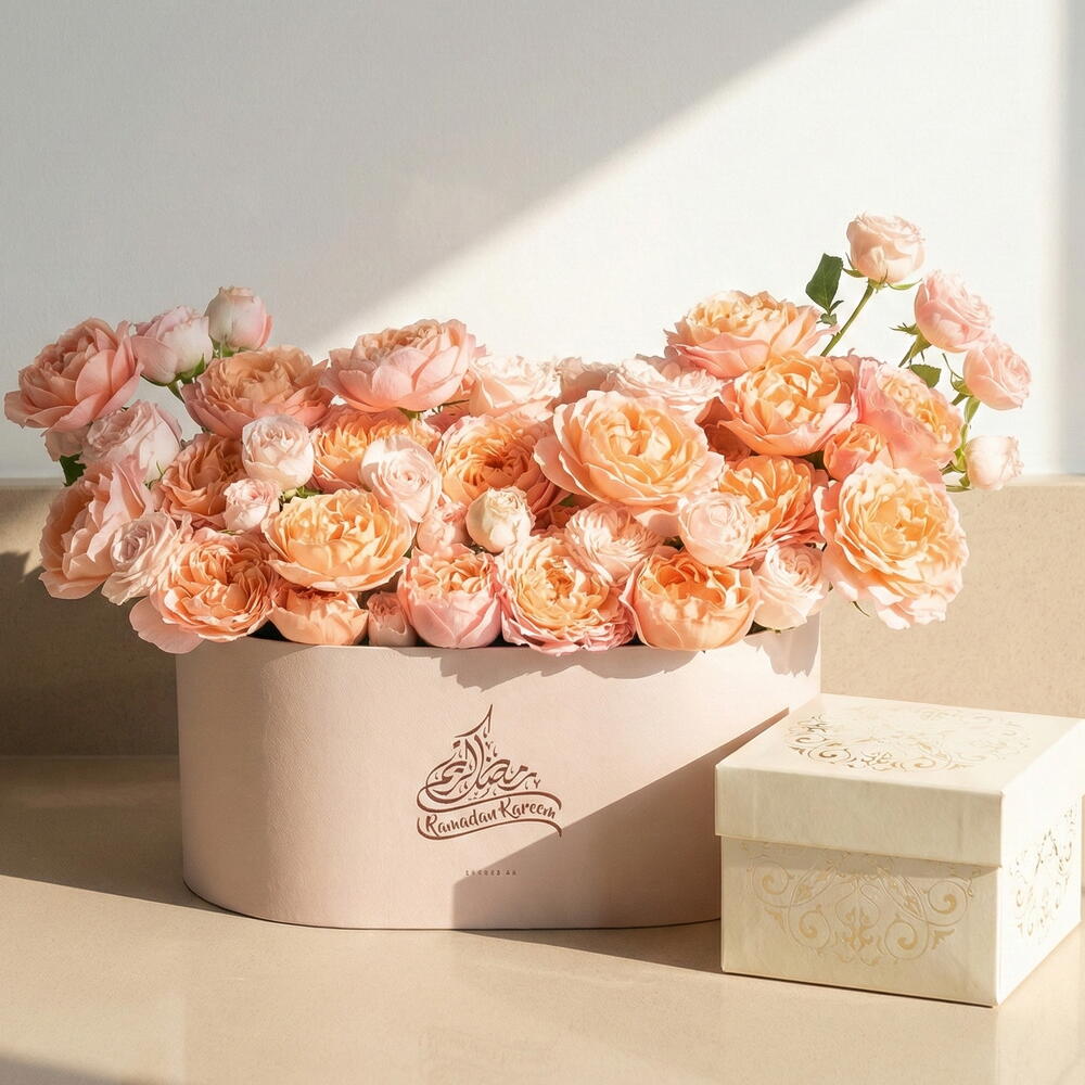 The Pastel Bloom Serenity with Raqiya Bakhoor — роскошный цветочный подарочный набор для Рамадана, сочетающий мягкие пастельные розы с вневременным ароматическим впечатлением. Созданный, чтобы передавать тепло, умиротворение и духовную элегантность, этот изысканный букет включает пышные персиковые розы Julietta и розовые спрей-розы Bombastic, оформленные в низком, широком силуэте. Подается в премиальной овальной коробке Ramadan Kareem; комплект дополнен коробкой Rasasi Raqiya Bakhoor, добавляющей традиционный ароматический ритуал, который усиливает вечера Рамадана и домашнюю атмосферу. Идеально подходит для хозяев ифтаров, семейных визитов, корпоративных подарков на Рамадан и духовных собраний, этот элегантный ансамбль сочетает визуальную красоту с душевным ароматом, создавая значимый жест, который отмечает щедрость и спокойствие.