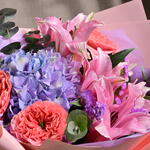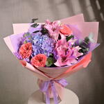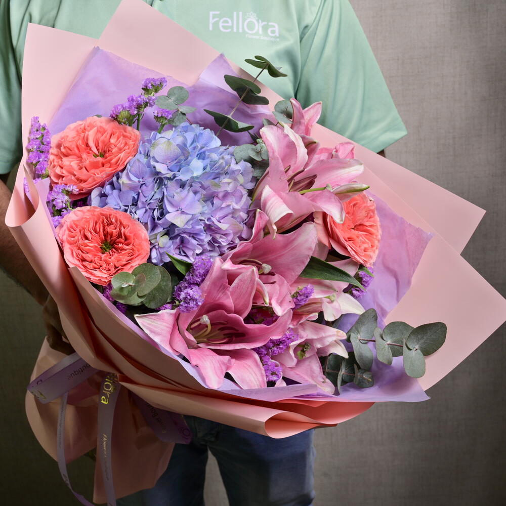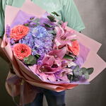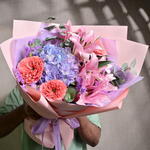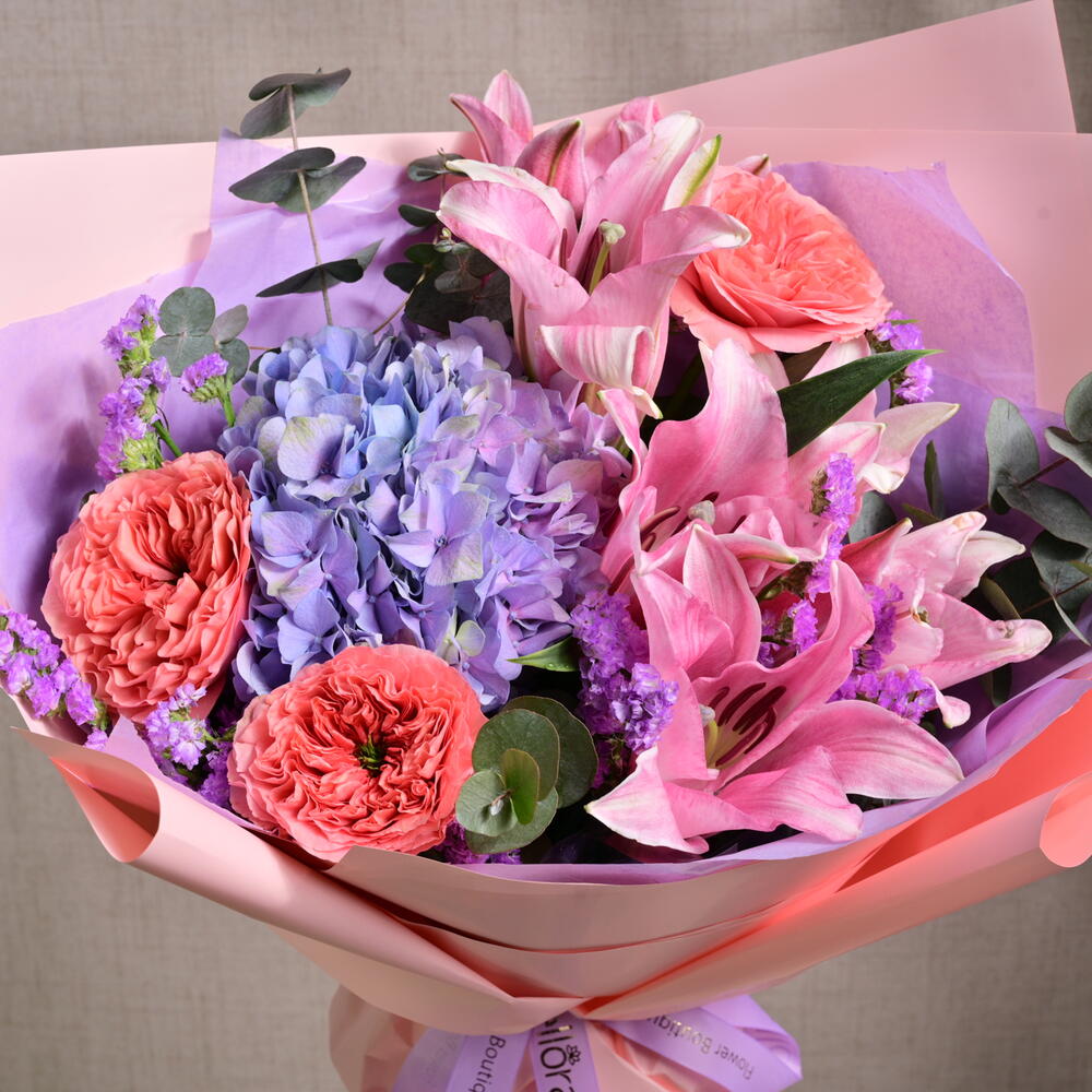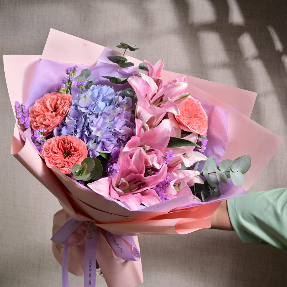 Очаровательная композиция, сочетающая мягкость розовых лилий, светло-фиолетовую гортензию и яркую розовую статицу, дополненная изящными розами Pink Expression. Букет подчеркнут легким акцентом эвкалипта, создавая свежий и элегантный букет, идеально подходящий для любого случая.