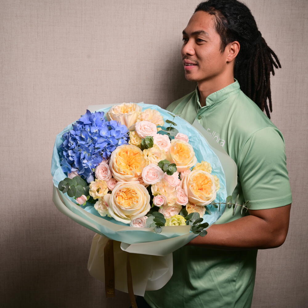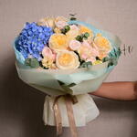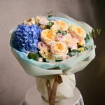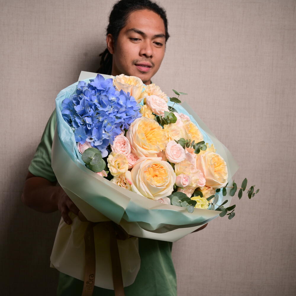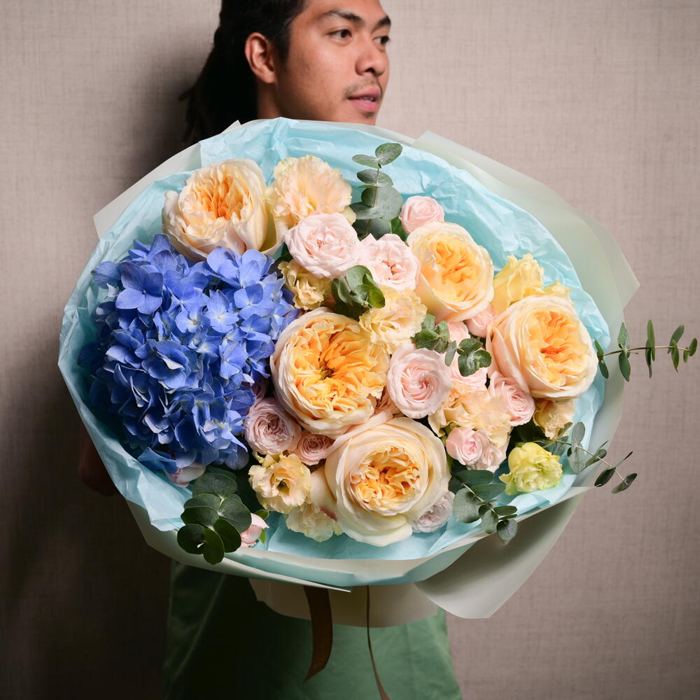 В этом потрясающем букете гортензии, розы Bombastic, эустома, кремовые розы Expression и эвкалипт создают мечтательный, мягкий пастельный образ, идеальный для любого случая.