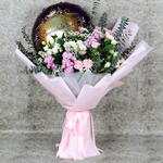 Фольгированный шар с надписью Congratulations, 5 розовых маттиол, 5 белых кустовых роз, 7 розовых гвоздик, Листва: 10 эвкалиптов и 5 одиночных рускусов, Наполнители: 2 стебля гипсофилы, красиво упаковано в розовую и прозрачную серебристую упаковку, перевязано розовой лентой с бантом.