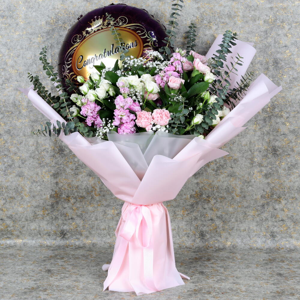Фольгированный шар с надписью Congratulations, 5 розовых маттиол, 5 белых кустовых роз, 7 розовых гвоздик, Листва: 10 эвкалиптов и 5 одиночных рускусов, Наполнители: 2 стебля гипсофилы, красиво упаковано в розовую и прозрачную серебристую упаковку, перевязано розовой лентой с бантом.