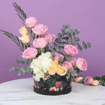 Описание товара: 1 белая гортензия 10 розовых роз Wham 5 персиковых роз Листва - 2 стебля Erica Palm и 3 стебля Cinerea Eucalyptus Оформлено в круглой коробке с цветочным принтом