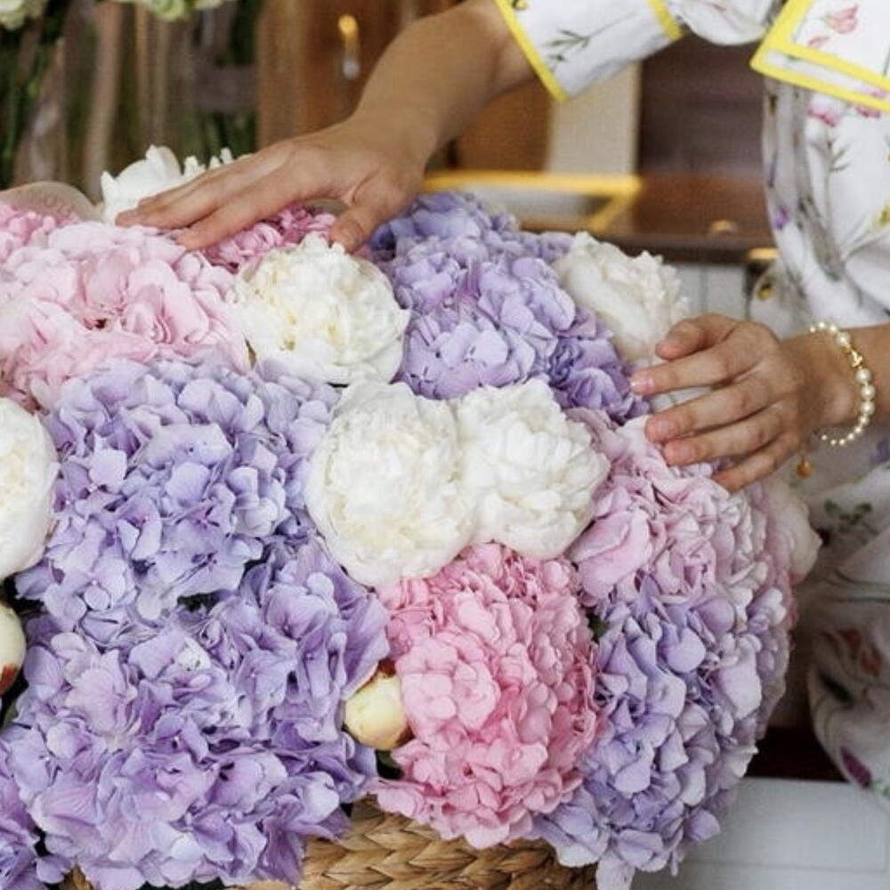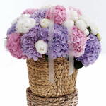Корзина «Пастельная поэзия» — изысканная и романтичная композиция, которая гармонично сочетает нежно-лиловые и румяно-розовые гортензии с пышными, ароматными снежно-белыми пионами. Внимательно оформленная в натуральной плетёной корзине ручной работы, эта композиция кажется лёгкой, поэтичной и непринуждённо элегантной.
