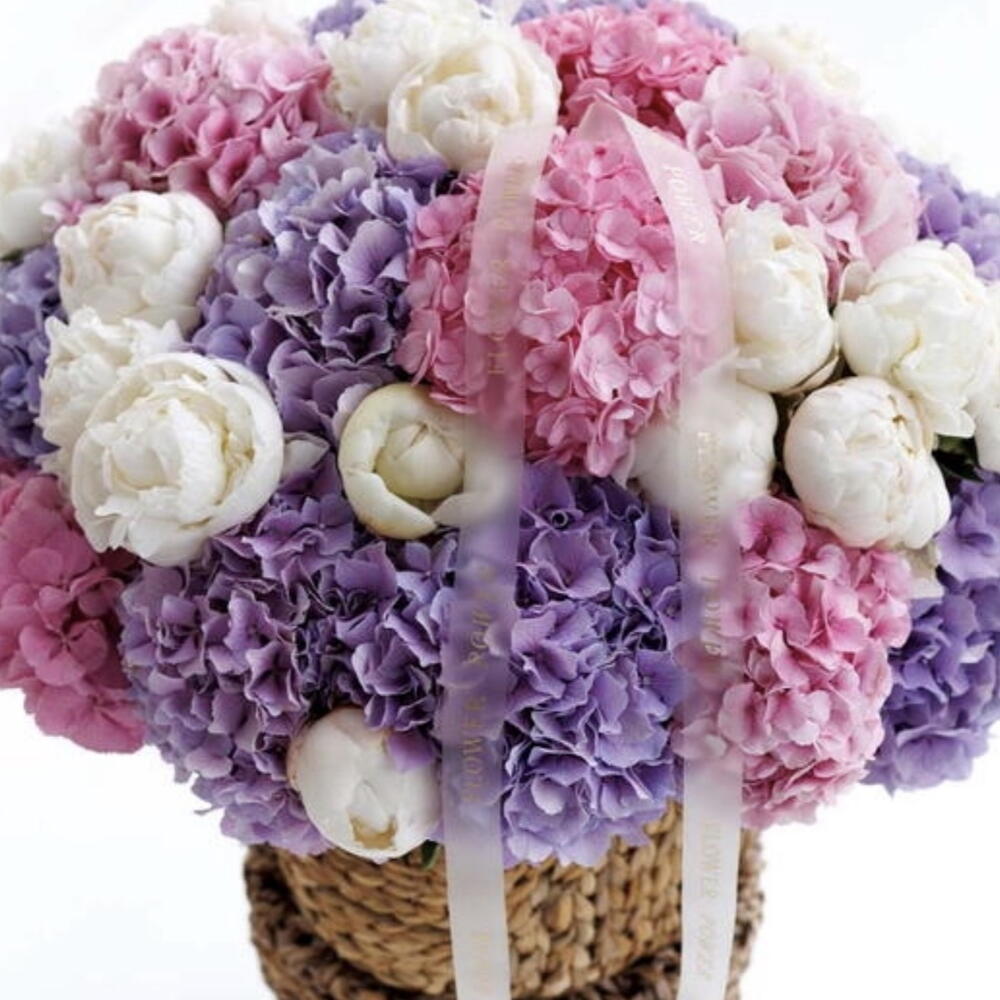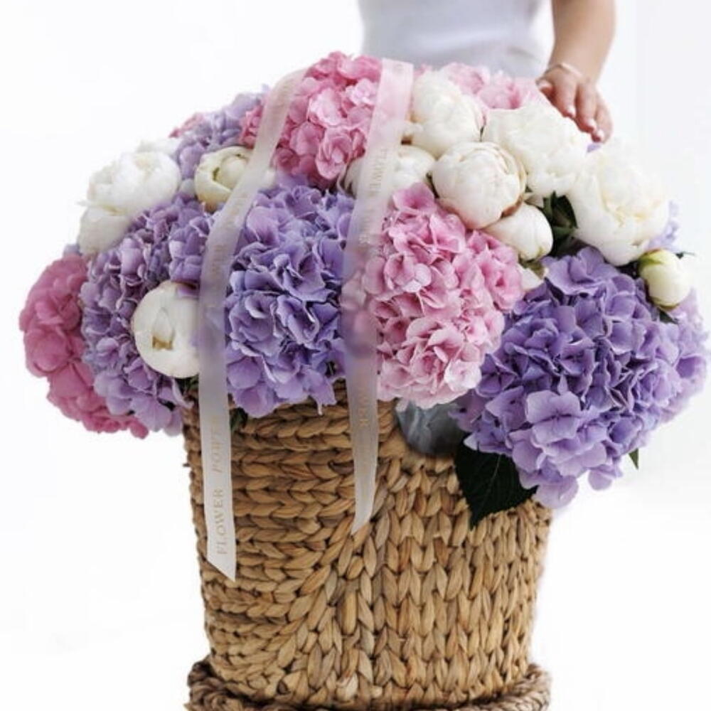 peony white - 30 шт. hydrangea purple - 15 шт. темно-розовые гортензии - 15 шт. плетёная корзина ручной работы - 1 шт.
