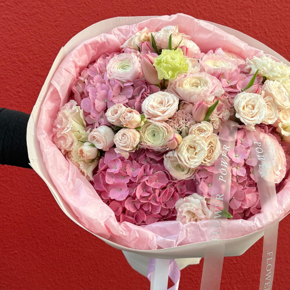 ranunculus pink - 7 шт. tulip pink - 7 шт. гортензии розовые - 4 шт. rose spray bombastic - 6 шт. светло-розовая эустома - 6 шт.