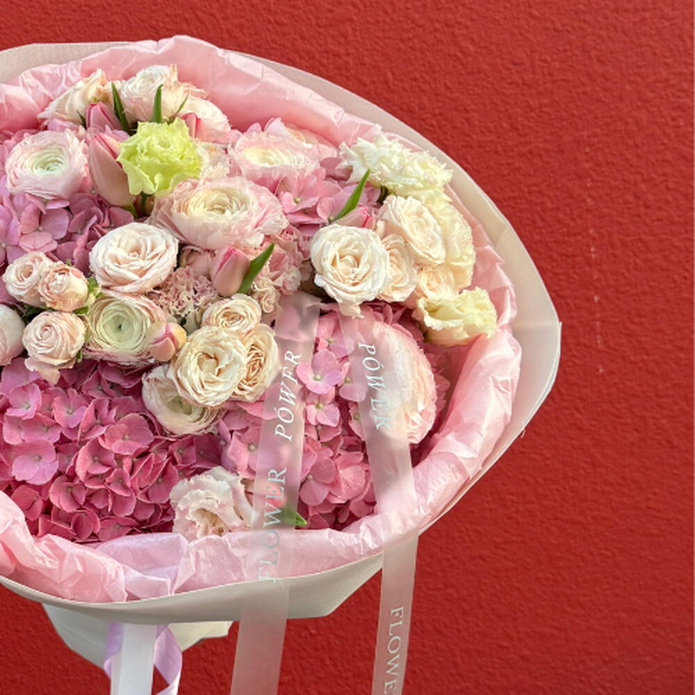 Окунитесь в чистую элегантность с нашим букетом Pastel Poise, тщательно подобранным шедевром мягких оттенков и премиальных фактур. Включая мечтательные морско-фиолетовые гортензии, романтичные спрей-розы Bombastic и нежные розовые ранункулюсы, эта композиция — высшее выражение утончённой роскоши.