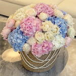 Роскошная и умиротворяющая композиция Pastel Reverie сочетает в себе нежные гортензии, пионы и романтичные розы в мягких оттенках розового, голубого и кремового. Представленная в изготовленной вручную корзине с ниспадающими жемчужинами, эта величественная работа является воплощением изысканного прибрежного шика — идеально подойдет для торжественных мероприятий, утонченного домашнего декора или в качестве впечатляющего свадебного подарка. Большой размер - 18 гортензий, 20 роз, 20 пионов